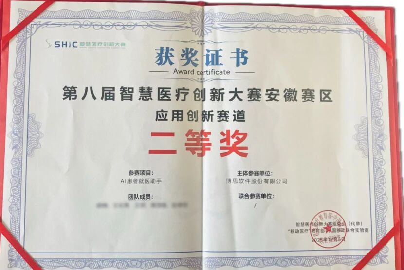 同时,博思软件“AI患者就医助手”荣获创新应用赛道二等奖,该智能助手凭借对真实就医场景的精准理解和覆盖“诊前-诊中-诊后”的全流程陪伴式服务,得到专家评委组的高度认可。