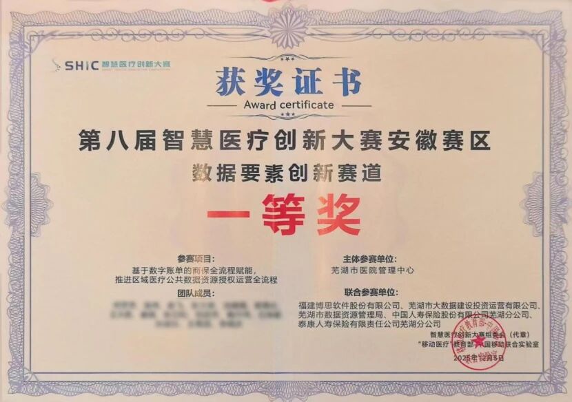近日,在第八届智慧医疗创新大赛安徽赛区区域决赛结果出炉,博思软件与芜湖市医院管理中心联合申报的“基于数字账单的商保全流程赋能推进区域医疗公共数据资源授权运营全流程”项目,以突出的创新性和实用性,在数据要素创新赛道荣获一等奖,并在区域总赛中脱颖而出,夺得全场第一,成功晋级全国总决赛。
